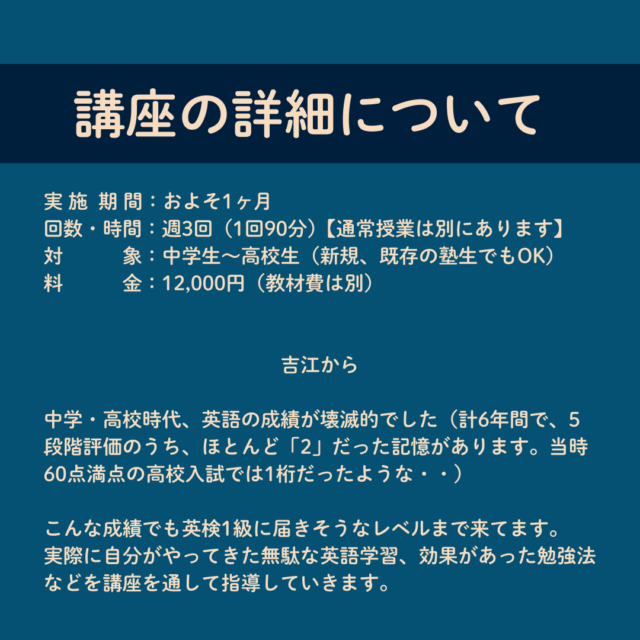 画像に大体のことが書かれていますが、学年末が終わったあたりから春休み入るまでの約1ヶ月間で英語特訓講座を行います。